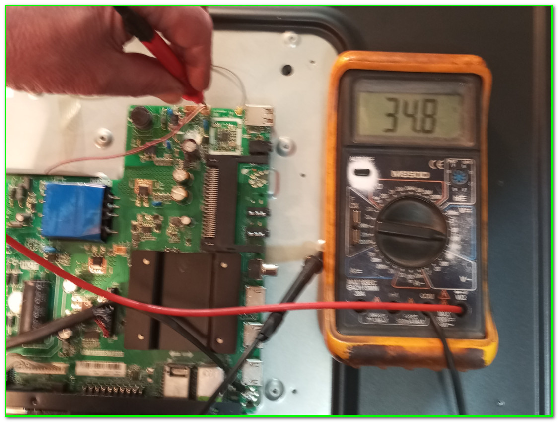 Ну ладно, будем смотреть что у нас на выходе драйвера подсветки происходит. А там картина следующая: в дежурном режиме мы наблюдаем присутствие +34.8V.