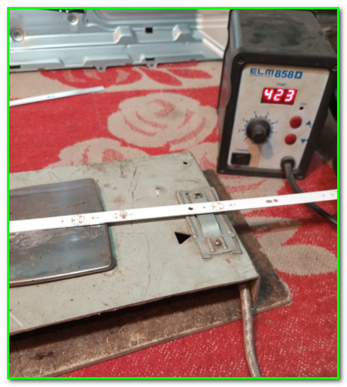 Так как планки на алюминиевой основе, то греть их придется сразу и сверху и снизу. То есть потребуется фен, и еще нижний подогреватель для пайки. В принципе подогреватель я не покупал- приспособил для этой цели самый обычный утюг. Правда пришлось немного с температурой поиграться- увеличил температуру нагрева примерно до 250°C.