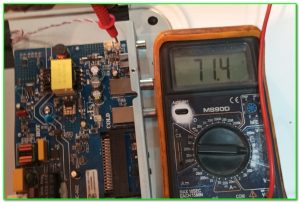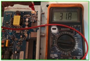 В дежурном режиме +31,8V. При попытке включить- наблюдаем бросок свыше +85V и затем плавное падение (сфоткать не успел). Ну что-же… Придется корыто разбирать…