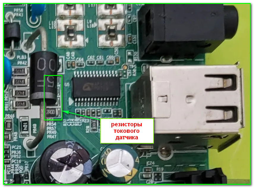 Токовый датчик- это резисторы с позиционными номерами PR54, PR57, PR40, PR47. Расположение- смотрим на картинке ниже (пардон за то что они получились «спрятанными» под диодом)