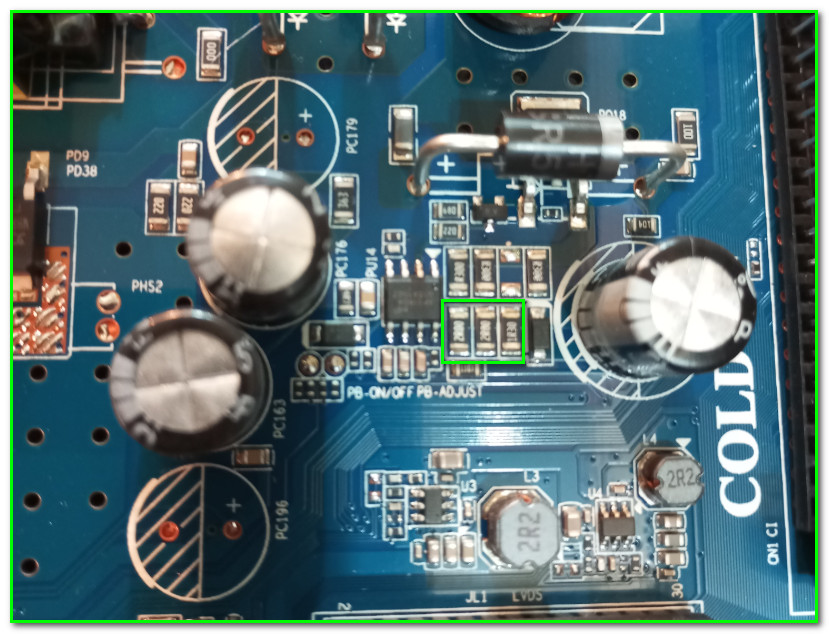Для того чтобы уменьшить подсветку на модуле CV9256-B42, необходимо произвести стандартную процедуру- увеличить номинал токового датчика. В данном модуле это три параллельно-включенных низкоомных SMD резистора (см. картинку ниже)
