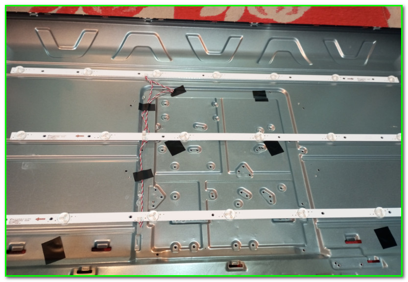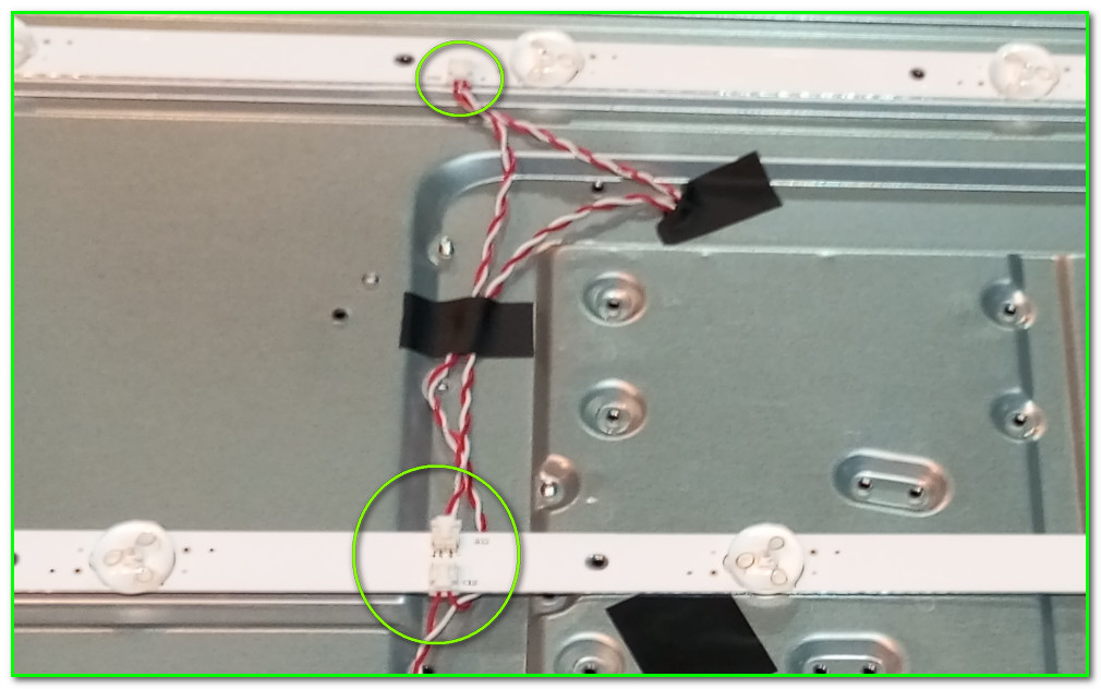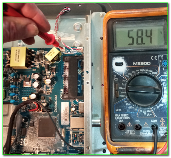Здесь мы поступим «по-колхозному»: не будем резать провода для проверки тока, а просто замерим напряжение. Что мы имеем: у нас подсветка раздельная. То есть два канала по 10 последовательно включенных светодиодов в каждом. Согласно закону Ома для последовательной цепи: ток распределяется равномерно, а напряжения должны складываться. Далее- простейшая математика: 10 светодиодов по 6 Вольт, получаем 60V.