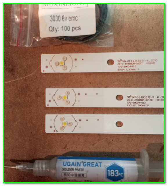 Если нужно больше информации по светодиодам- то называются они 3030, 6-ти Вольтовые, контакты EMC. Вся инфа где их купить находится на ЭТОЙ странице