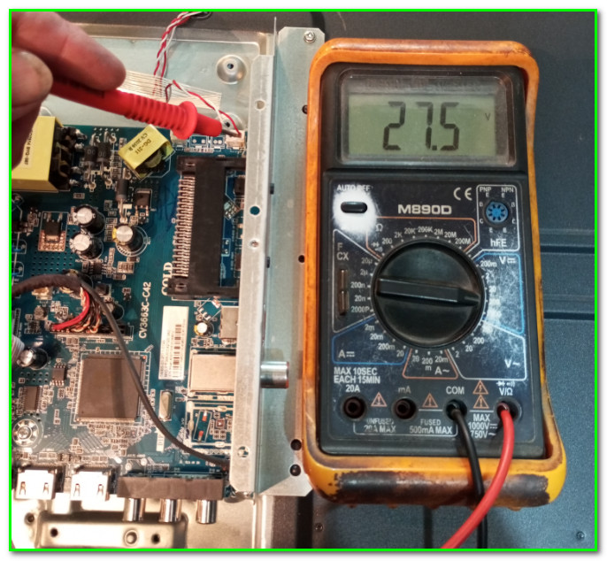 Здесь все чрезвычайно просто- мультиметр в режим измерения напряжения, «минусовой» щуп на корпус, «Плюсовой»- на разъем подключения подсветки. В дежурном режиме мультик показал +27.5V.