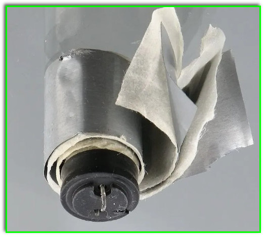 Конденсатор (или в простонародье Кондер, Лит, Электролит) это две полоски алюминиевой фольги разделенные диэлектриком (чаще всего бумагой), и свернутые в трубочку для компактности.