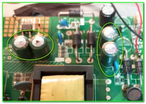 Как Вы все уже наверняка заметили на картинке выше- у нас наглядно наблюдаются 4 «беременных» электролита по выходу блока питания и на подсветке