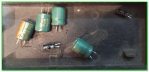 Как мы видим на картинке чуть выше- у нас отыскалась еще парочка неисправных небольших черненьких конденсаторов емкостью по 47 мкФ каждый, и вот здесь обратите внимание: внешний вид у них вполне прекрасный!