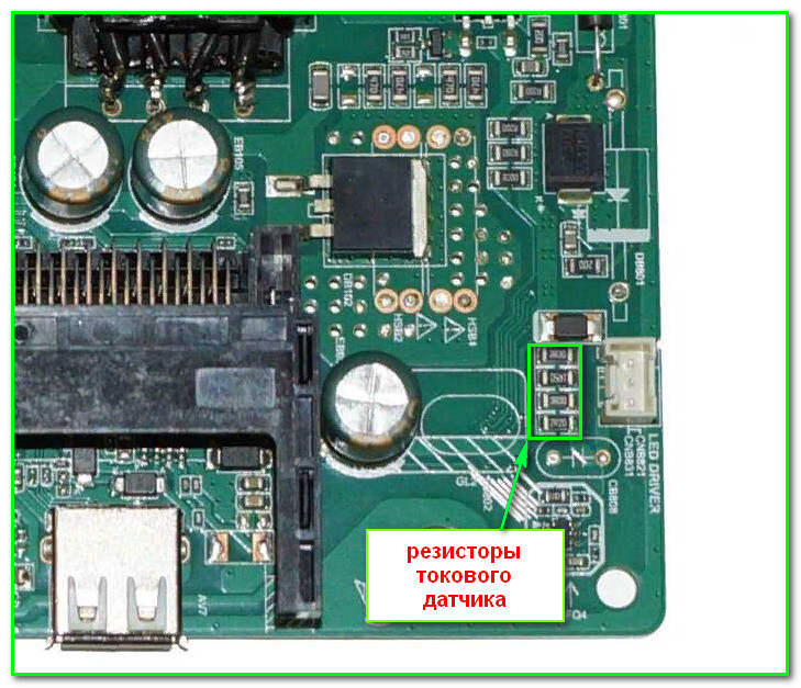 Для уменьшения тока подсветки совершаем стандартную процедуру- то есть увеличиваем номинал токового датчика. На модуле это набор низкоомных параллельно-включенных SMD резисторов. Расположены они рядом с разъемом подключения планок (см. картинку ниже)