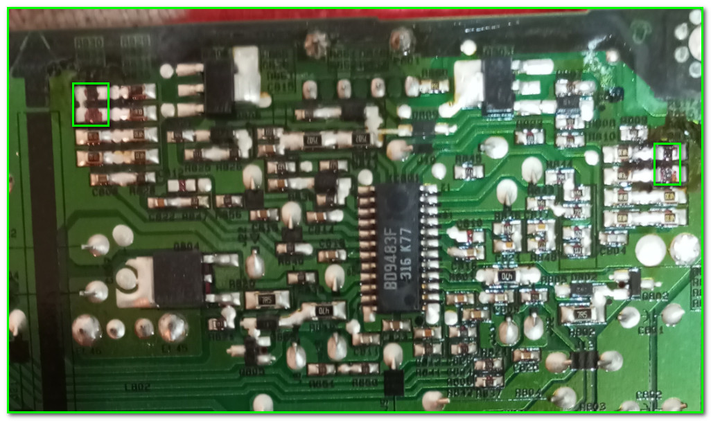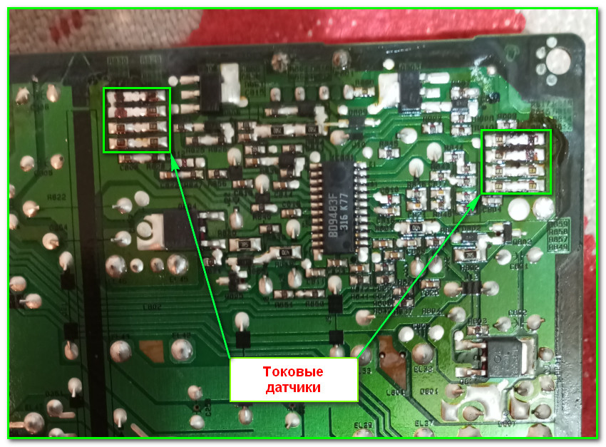 Процедура уменьшения тока подсветки на данном модуле ничего необычного не представляет: все стандартно- необходимо увеличить номинал токового датчика. Однако здесь имеется нюанс: в телевизоре подсветка выполнена раздельно на два канала. Поэтому в модуле присутствуют зразу два токовых датчика