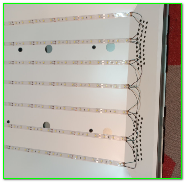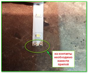 Нарезаем ленты на 7 одинаковых отрезков. Длина каждого из них должна быть по горизонтали поддона телевизора. И затем равномерно вклеиваем их в поддон. Перед вклеиванием нужно облудить контактные площадки. Ну, в смысле, заранее нанести на них припой.
