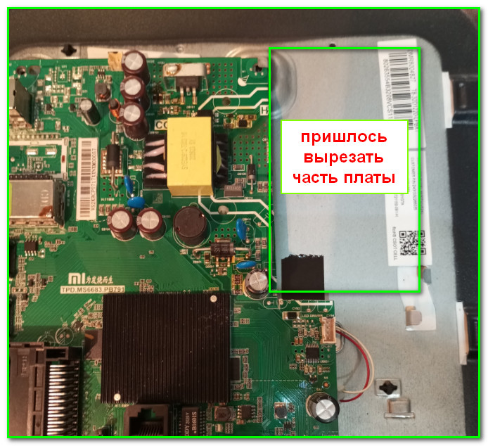 Внутри телека совершенно не было места чтобы воткнуть туда дополнительный источник +12V. Так что пришлось вырезать часть платы. Точнее сказать всю «горячую» сторону блока питания.