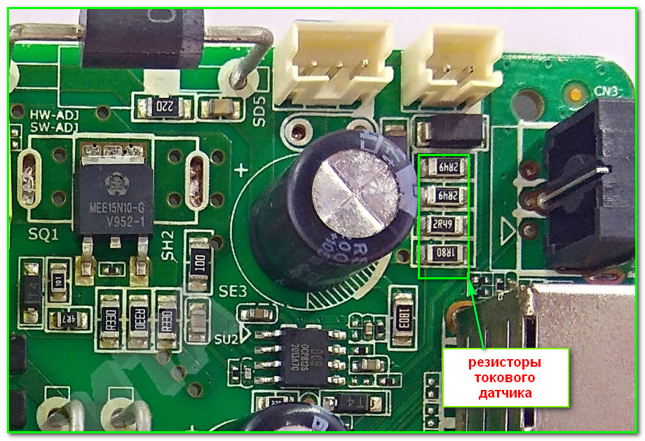 Процедура уменьшения тока подсветки здесь вполне стандартная- необходимо увеличить номинал токового датчика. На самом модуле это на набор параллельно-включенных низкоомных SMD резисторов. Местоположение указано на картинке ниже: