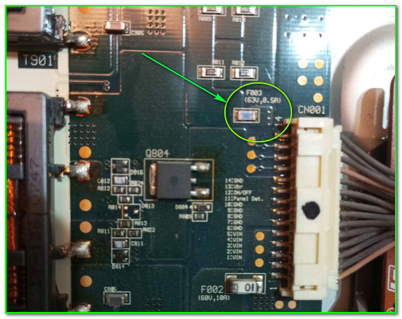 Так вот- причиной такого поведения является неисправность инвертора подсветки. Причем чаще всего просто-напросто обрывается предохранитель F003 (63V, 0.5A)