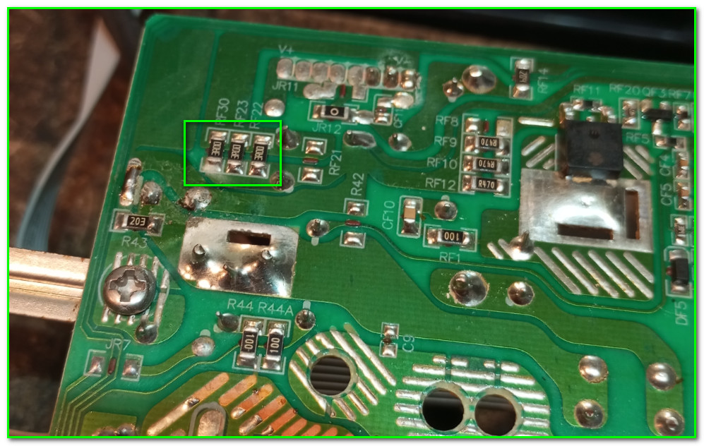 Конечно-же это все надо обязательно чистить, лудить и пропаивать. Заодно сразу и ток подсветки уменьшим пока плата снята. Делается это элементарно- в токовом датчике имеются три резистора по 3 Ома каждый. Один из них можно смело выбрасывать
