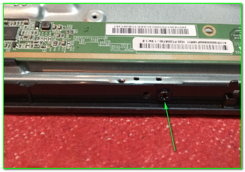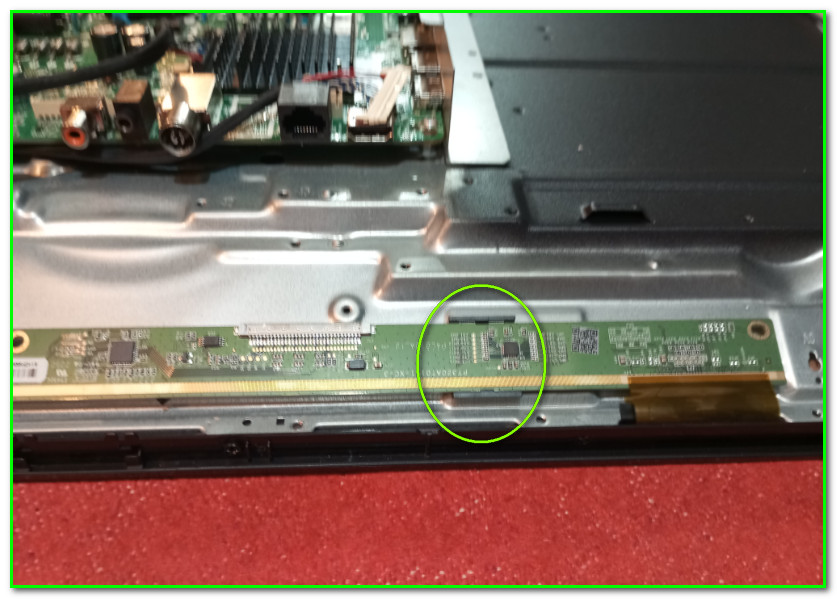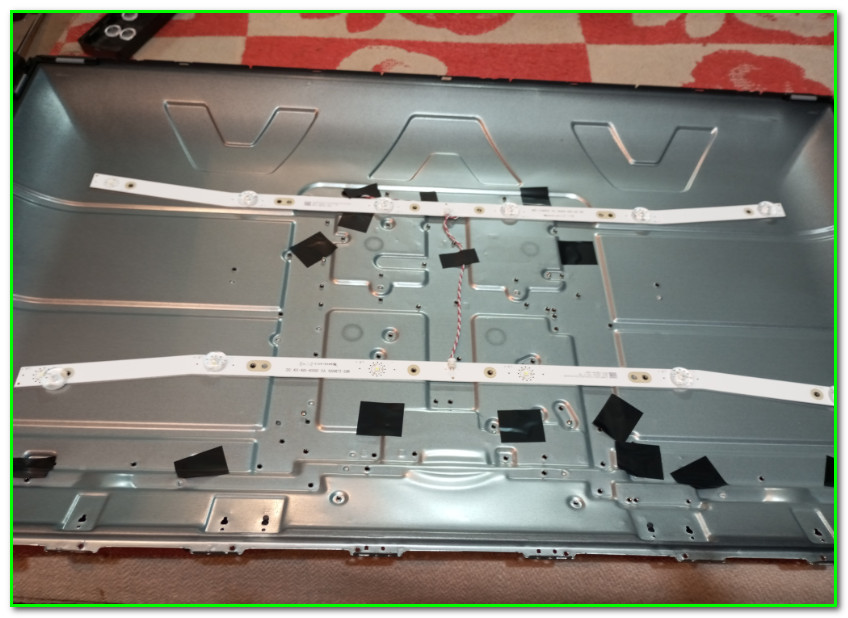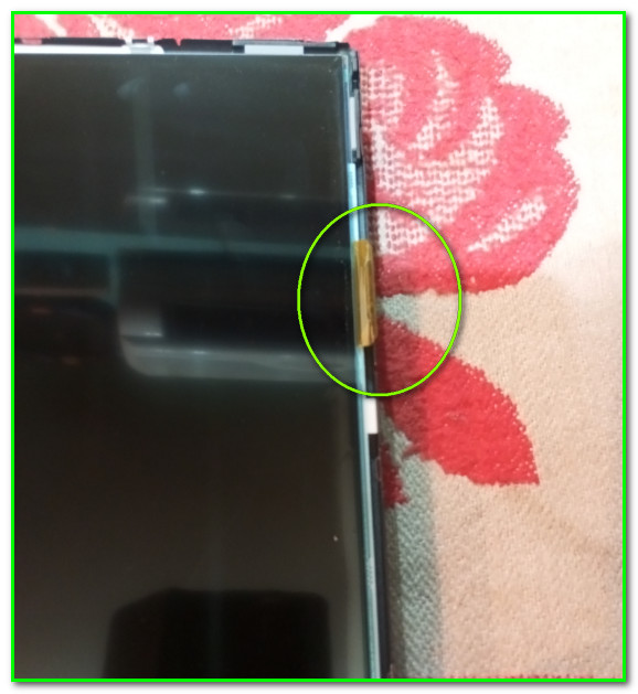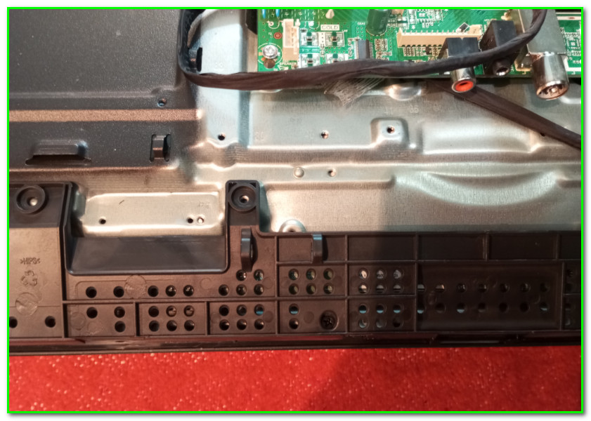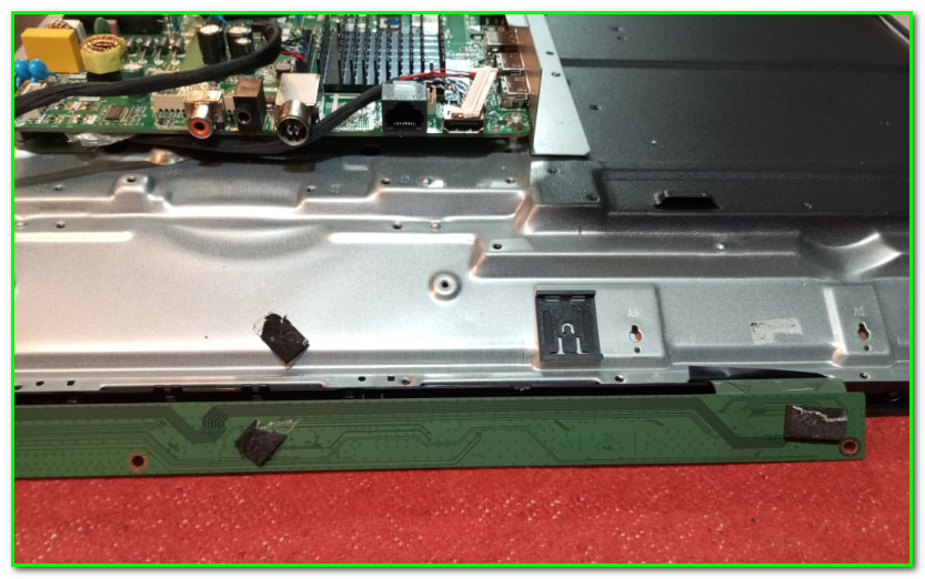 Остальная часть рамки- стандартные защелки. По матрице можно сказать следующее: не приклеена (что не может не радовать), но следует обратить внимание что справа имеются два «лепестка». При сборке телека не забываем заправить их на место!!!