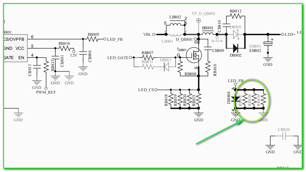 Согласно схемы процедура уменьшения тока подсветки на шасси TP.MS3663S.PB765 заключается в увеличении номинала токового датчика, подключенного к шине LED_FB. На схеме это резисторы R837…R839