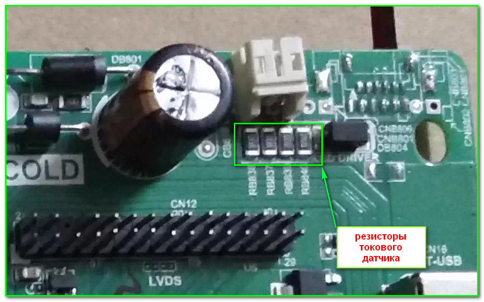 Уменьшение тока подсветки представляет стандартную процедуру- увеличиваем номинал токового датчика в драйвере подсветки. Визуально это несколько параллельно-включенных низкоомных SMD резисторов, номинал которых может колебаться в пределах 1R0….5R1